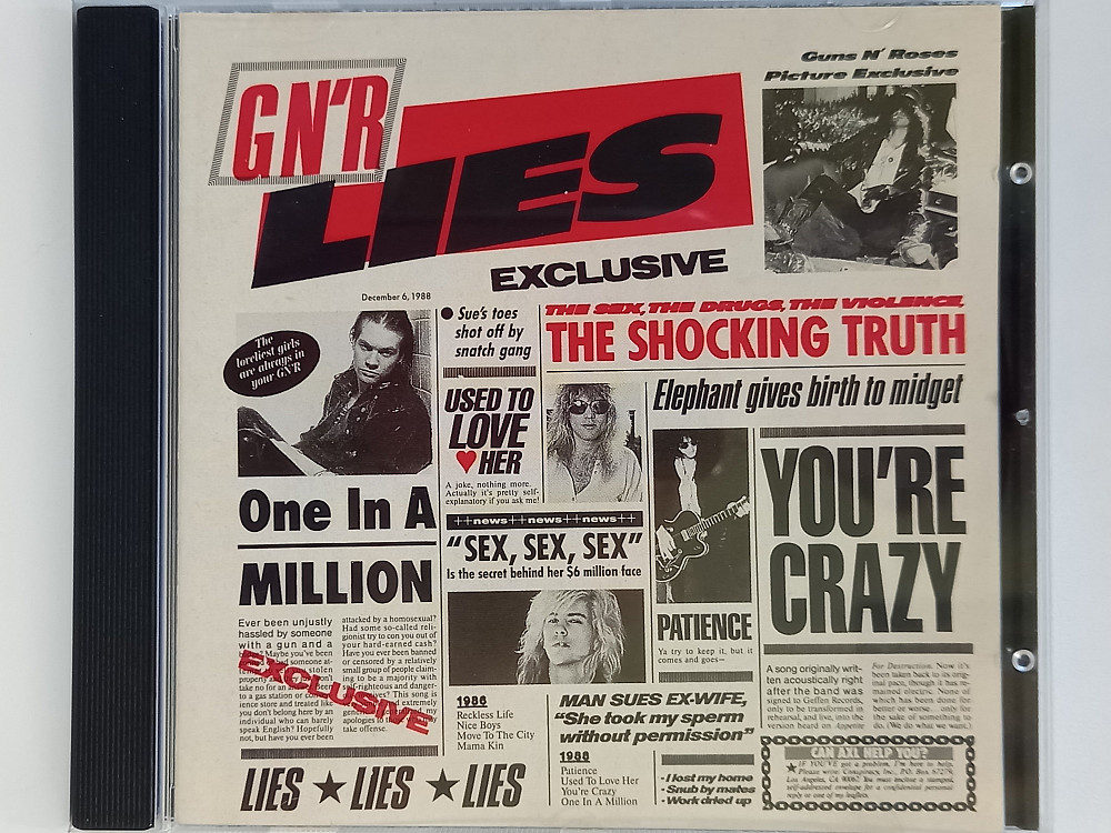 When Guns N' Roses emerged from L.A.'s Sunset Strip scene in the mid-1980s, the band embodied a dangerous, snarling-attitude and slashing-riffs side of rock & roll that had been absent in the countless hair-metal bands cluttering the music industry at the time. Led by volatile frontman W. Axl Rose, GN'R was powered by the dual-guitar attack of Izzy Stradlin and Slash that made the band's full-length debut, APPETITE FOR DESTRUCTION, an instant classic. The APPETITE FOR DESTRUCTION follow-up, LIES, combined the band's live 1986 EP, LIVE LIKE A SUICIDE and four new studio tracks. The first half finds GN'R tearing it up in concert with such incendiary tracks as "Reckless Life" and "Nice Boys." These ripping anthems, along with a smoking cover of "Mama Kin" made the band the heir apparent to Aerosmith, the original bad boys of rock. The second half of LIES is what tossed GN'R into a sea of controversy. Although a track like the sensitively wrought LIES ruffled few feathers, songs like "Used to Love Her" and "One in a Million" brought on accusations of misogyny and bigotry.