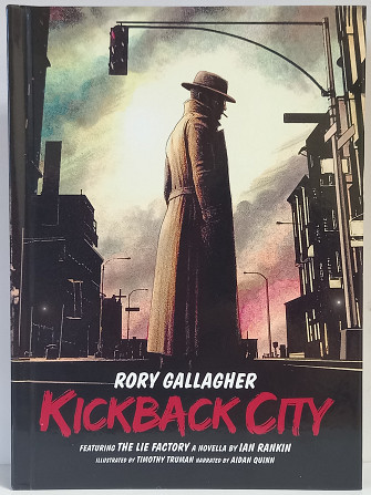 KICKBACK CITY is a compilation of crime noir inspired music from Rory Gallagher that is a perfect marriage of content and presentation. On 28 October 2013 was released KICKBACK CITY a unique immersive album inspired by the crime noir passion and music of Rory Gallagher. Featuring a specially compiled album of Rory Gallagher’s best crime novel influenced music; the stunning package also includes an exclusive new novella by Ian Rankin fully illustrated by graphic artist Timothy Truman. This unique immersive album also includes a special narration of the story by actor Aidan Quinn. Inspired by Rory Gallagher’s passion for crime novels, KICKBACK CITY is a creative collaboration combining the words of Ian Rankin, the illustrations of Timothy Truman and of course the music of Rory Gallagher. The result is a brand new kind of concept album – a must have for fans of Rory Gallagher, Ian Rankin, graphic novels and newcomers alike. KICKBACK CITY packaged like a hardback book housing 3 audio discs, including an audio version of the book read by Hollywood Actor Aidan Quinn, the 44 page novella THE LIE FACTORY and four ‘crime scene’ postcards. As well and the crime inspired Rory Gallagher compilation album, the set also includes a collection of live ‘crime’ tracks (KICKBACK CITY Live) recorded at the Cork Opera House, never before available as an audio release.