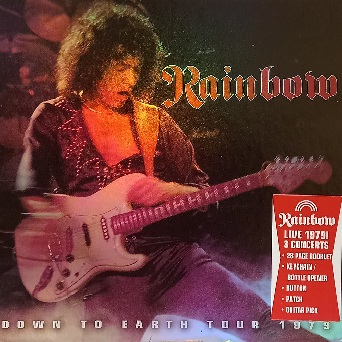 A deluxe limited edition box set of never-before-released vintage live performances capturing Ritchie Blackmore’s hugely influential band on tour in support of their stellar Down To Earth album. Down To Earth was the band’s breakthrough commercial success faturing new vocalist Graham Bonnet. Rainbow’s DOWN TO EARTH TOUR 1979 is a three-CD box set that, in addition to the music, comes with the “extras” that boxsets all seem to have these days. This box includes a 28 page book, a metal bottle opener, an embroidered cloth patch, a badge and a Ritchie Blackmore guitar pick. Fair enough, but the real reason fans buy these boxsets are not for the trinkets, but the music. Often the big attraction is rarities such as previously unreleased tracks, demos and alternate versions of well-known songs and live recordings. So let’s dive into it. The three discs are live recordings of Rainbow concerts in 1979. Disc One is Denver, Disc Two is Long Island and Disc Three is Chicago. Somewhat surprising is that the first two discs have the same seven tracks, in the same order. Disc Three has a mere five tracks. Before we get to the music itself, anyone who is a fan of Ritchie Blackmore and Rainbow will know that these CDs comprise two eras of Rainbow: first with Ronnie James Dio and then later with Graham Bonnet. Bonnet does a very good job covering the two Dio tracks, but he also has a well-deserved reputation as a screamer, and there are a few cringe-worthy moments in this collection where his off-key howls are like nails on chalkboard. That said, the band is tight and the players other than hit their marks without fail.