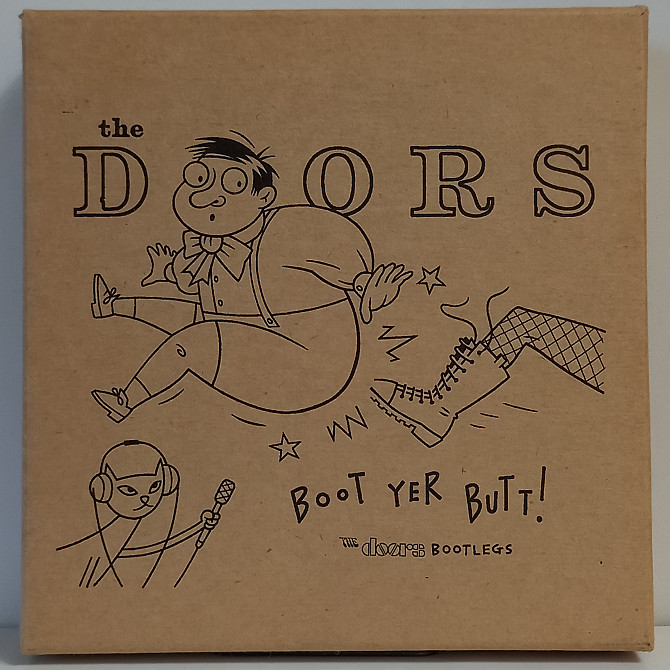 Comprehensive 'official bootleg' four-CD set compiled by Robbie Krieger. Compilation of live audience recordings with 12 page booklet of Robby Krieger's reminiscences. Four-disc box set released officially by Rhino Handmade / Bright Midnight Records featuring songs that were recorded as bootlegs during concerts of The Doors ranging from the years 1967 to 1970. Features 43 bootleg tracks recorded at live performances. Songs selected by Robby Krieger. The sound is typical for bootlegs. This is part of previously unreleased material of the Bright Midnight Archives collection of live albums by the Doors. Starting with the earliest known live recordings of The Doors at the Avalon in 1967 and ending with LA Woman songs from their penultimate show at Dallas State Fair in 1970, the casually named BOOT YER BUTT! is the last word in Doors archiving. Generally avoiding the obvious, guitarist Robbie Krieger’s selections mine the blues hinterland of the band (“I’m A Man”, “Little Red Rooster”) and includes the MOR “The Soft Parade” plus brass, as well as all the big classics. High-quality sound and packaging aside, these discs offer a fascinating chronicle of a ’60s band en route from clubs and high school halls to the Madison Square Garden and beyond. A fine distillation of an epic that only lasted for four years.