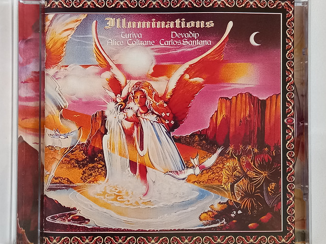 ILLUMINATIONS is a 1974 collaboration between Alice Coltrane and Carlos Santana (under their Indian names “Turiya” and “Devadip”, respectively). Alice Coltrane performs on harp, piano, and Wurlitzer electric organ and arranged and conducted the string section. Carlos Santana plays his electric guitar in a more minimal style than usual, utilizing feedback, sustain and simple melodic statements to create atmosphere and lend space to the other instruments. The album is all instrumental, with lengthy solos from most of the participants. The string section introduction to "Angel of Air” has been sampled by the Cinematic Orchestra. This is the first of three Santana albums (the others being Oneness and The Swing of Delight) to be released under his Sanskrit name Devadip, given to him by guru Sri Chinmoy.