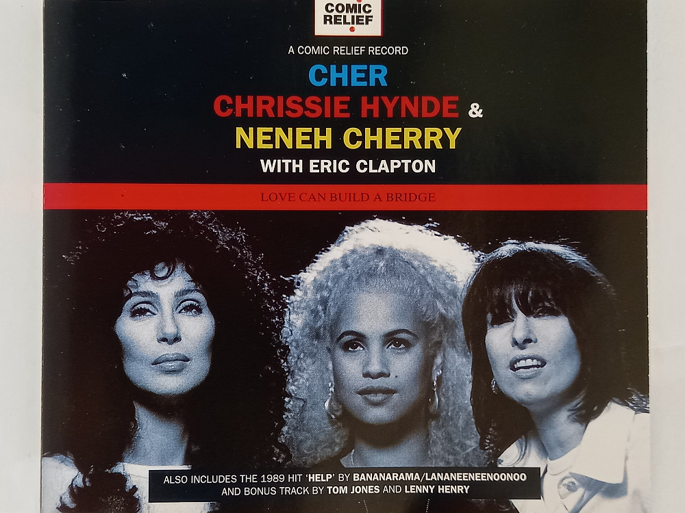 LOVE CAN BUILD A BRIDGE is a song written by Naomi Judd, Paul Overstreet, and John Barlow Jarvis, and recorded by American country music duo the Judds. It was released in 1990 as the second single and title track from their album of the same name. It was a top-five country hit in mid-1991. The song was later covered by Children For Rwanda as a charity single in aid of Save The Children, reaching number 57 on the UK Singles Chart in September 1994. A new version recorded by American singers Cher and Chrissie Hynde, Swedish singer Neneh Cherry, and British singer-guitarist Eric Clapton was released as 1995's official Comic Relief single. This version topped the UK Singles Chart for one week in March 1995; it was Cher's and Hynde's second solo UK number-one hit and the only UK number-one single for both Cherry and Clapton. It was chosen as 1995's official Comic Relief single. 1995 UK 4-track CD maxi-single including Instrumental plus Help by Bananarama/Lananeeneenoonoo and Cant Get Enough Of Your Love by Tom Jones & Lenny Henry.