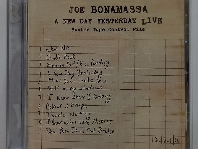A NEW DAY YESTERDAY LIVE is the first live album by American blues rock musician Joe Bonamassa. Recorded on 21st December 2001 during the promotional tour for Bonamassa's debut album A New Day Yesterday, it was released in March 2002 by Premier Artists. A NEW DAY YESTERDAY LIVE documents the final date of a sixty-day jaunt during blues guitar prodigy Joe Bonamassa's 2001 tour in support of his debut bearing the same title. What's clear is that the young guitarist's trio lacked nothing in terms of on-stage presence and performing tightness as compared to what was heard on said studio album. Their kinetic reinventions of oft-overlooked '70s rock classics such as Free's "Walk In My Shadows" and Jethro Tull's "A New Day Yesterday" instantly distinguish Joe Bonamassa from teenage blues competitors such as the overly Stevie Ray Vaughan-reliant Kenny Wayne Shepherd or the more purist and technically less dazzling Jonny Lang, and his better-conceived originals, "Colour & Shape", the wonderful "Miss You, Hate You", stand up under any circumstance. This was a great show. Unfortunatly most of the crowd became to intoxicated to help in the second take recordings of ''Miss You, Hate You'' and ''If Heartaches Were Nickels''. You'll however have be a big fan since that great show.
