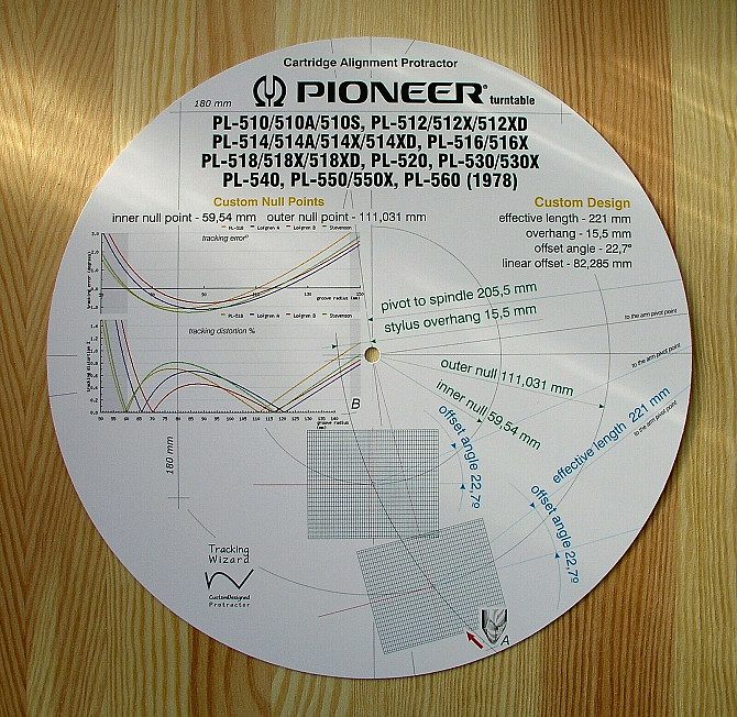 Предлагаю индивидуальный шаблон для юстировки картриджа проигрывателей винила (Protractor). Шаблон позволяет произвести юстировку согласно оригинальной геометрии тонарма конкретной модели проигрывателя винила (в тех случаях, когда известны все необходимые геометрические параметры тонарма) либо максимально близкой к ней. Модели проигрывателей/тонармов, для которых рассчитан шаблон, указаны на этом самом шаблоне.