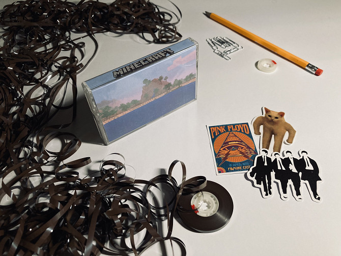 Аудіокасета з музикою з гри Minecraft, а саме, C418 (справжнє ім’я Даніель Розенфельд) — німецький композитор, який прославився завдяки створенню саундтреку до гри Minecraft. Його музика — це медитативна електроніка, ambient, що створює глибоку емоційну атмосферу. C418 став символом цілого покоління геймерів, які виростали з його звуковими ландшафтами.