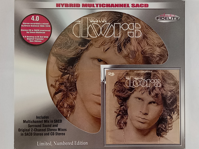 Audio Fidelity’s multi-channel SACD release schedule gathers pace with what is likely to be the most popular disc issued to date: THE BEST OF THE DOORS. This is the eleven-track compilation that was originally issued in 1973, and the hybrid SACD includes both the original Quad Mix and the two-channel stereo mix. The Doors’ music has been issued in surround before of course, for the Perception Box Set back in 2007 but that was 5.1 and this is the original 4.0. Audio Fidelity has done an excellent job on its release of this SACD that was originally released in Quad 4.0 vinyl back in the day. It's definitely one of the better Quad's that had back in the day and this SACD captures it all minus the pops 'n ticks that plague vinyl copy after all these years. Riders on the Storm - in multichannel - is a real treat to the ears. On this particular SACD - there is a nice separation for the 4 channels. The vocals are font and center while the instruments share rear and front. And all are in good balance. Definitely adds depth to the music - revealing things that hadn't heard on the vinyl for sure. A great release!