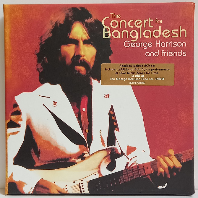 THE CONCERT FOR BANGLADESH (originally spelt THE CONCERT FOR BANGLA DESH) is a live triple album credited to George Harrison And Friends and released on Apple Records on 20th December 1971. The album followed the two concerts of the same name, held on 1st August 1971 at New York's Madison Square Garden. The shows were a pioneering charity event, in aid of the homeless Bengali refugees of the Bangladesh Liberation War. The event brought Harrison and Starr together on a concert stage for the first time since 1966, when The Beatles retired from live performance, and represented Dylan's first major concert appearance in the US in five years. The album cover, designed by Tom Wilkes, consisted of an image of a malnourished child sitting beside an empty food bowl. On release, THE CONCERT FOR BANGLADESH was a major critical and commercial success. Together with the concert film, the album gained Indian classical music its largest Western audience up until that time. It was reissued in 2005, four years after Harrison's death, with revised artwork. Although the cover art has been changed to a image of Harrison, the original iconic image of a sad-eyed child remains prominent in the CD and DVD packaging. This landmark concert has stunningly remastered from the original source tapes and was re-released in deluxe packaging on 24th October 2005. In addition the remastered album includes a previously unreleased track from the concert the Bob Dylan performance of "Love Minus Zero/No Limit".