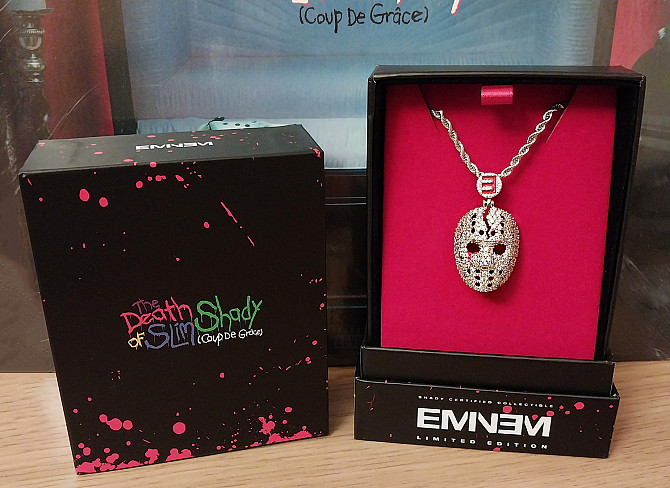 Продається лімітований колекційний "діамантовий" кулон у вигляді хокейної маски з офіційної лінійки мерча Емінема, присвяченої виходу альбому "The Death of Slim Shady (Coup de Grâce)". Кулон йде разом із ланцюгом у брендованій коробці. Присутня імітація інкурстації кулону дорогоцінним камінням.