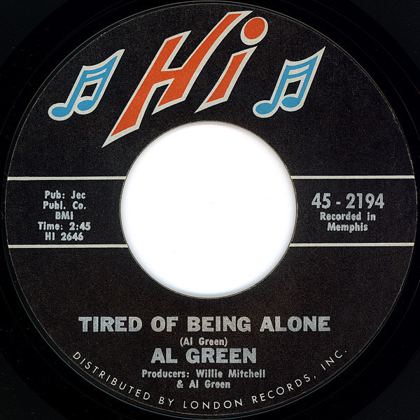 Al Green ‎– Tired Of Being Alone / Get Back Baby (Hi Records ‎– 45-2194, 7", 45 rpm, single, styrene, Pitman pressing, USA, 1971).