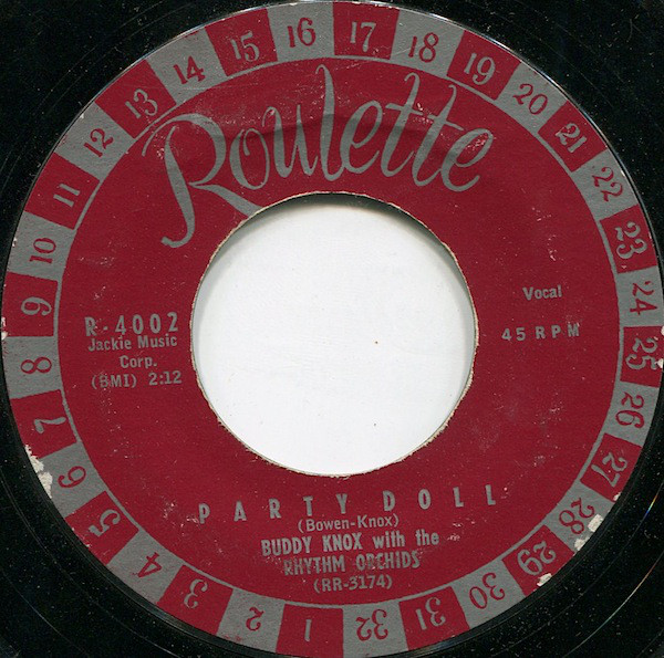 Buddy Knox With The Rhythm Orchids – Party Doll / My Baby's Gone (Roulette – R-4002, 7", 45 rpm, styrene, USA, 1957).