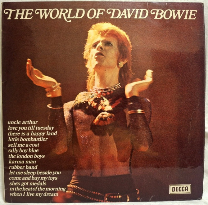 Вінілова платівка. Перша, в дискографії, офіційна студійна збірка найкращих хітів, Британського глем-рок, поп-рок, хард-рок музиканта, володара титулів зірки алеї слави, Ордена Британської Імперії, Ордена мистецтва та літератури, покійного вже, Девіда Роберта Джонса, більше відомого під сценічним ім'ям Девід Боуі (The World Of David Bowie) 1967-70. Випуск фірми (Decca) England, 1970-ий рік. Оригінальне, Британське видання. Стан платівки ЕХ-. Конверт ламінований. Стан конверту ЕХ. Відправка по Україні службами доставки: Нова Пошта, Укр Пошта, Делівері. Також відправляємо посилки за кордон по цілому світу.