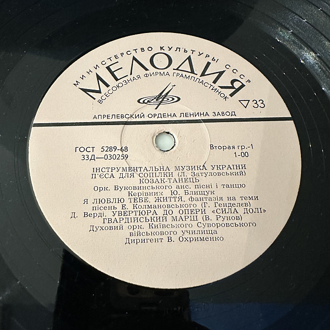 Сборник из конца 70-х Інструментальна Музика України. Очень редкая ошибка на пятаке - на обоих сторонах наклейка Стороны А. Техконверт, пластинку поставлю VG+, нужно помыть. Бонусом идет такая же пластинка, но без ошибок на пятаке и, к сожалению, на ней имеются царапины.