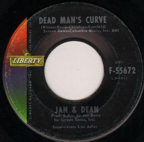 Jan & Dean ‎– Dead Man's Curve / The New Girl In School (Liberty ‎– F-55672, 7", single, Indianapolis pressing, USA, 1964).