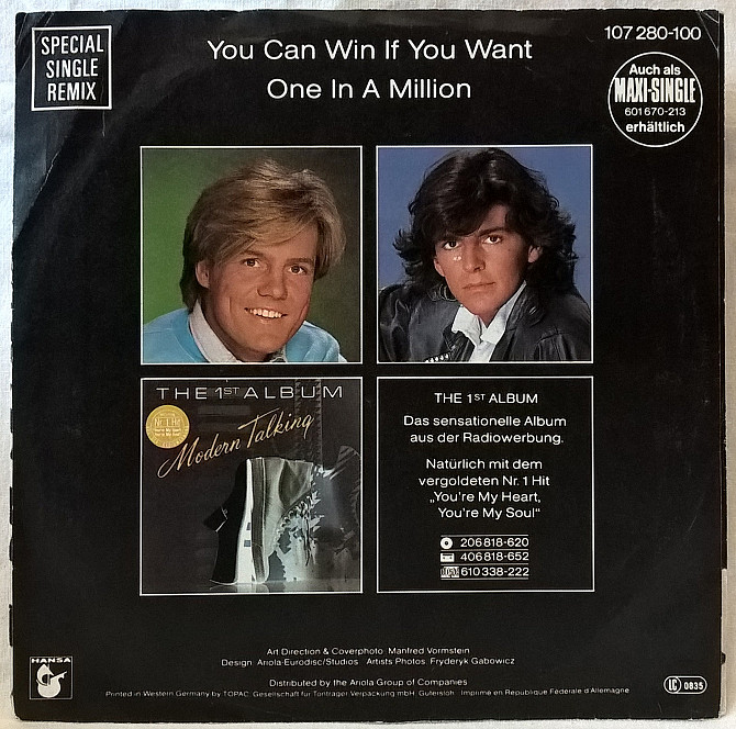 Оригинальная фирменная виниловая пластинка. Single (LP7). Второй студийный каталожный мини-сингл легендарной Западно-Германской поп- группы Modern Talking – You Can Win If You Want (Special Single Remix) 1985. Оригинальное Германское издание. Выпущено фирмой (Hansa) Germany в 1985-ом году. Пластинка в хорошем состоянии, относится к категории VG+. Состояние конверта EX+. Отправляем Новой Почтой, Деливери, Укр Почтой /Предоплата/ (На выбор покупателя), возможна отправка за границу.