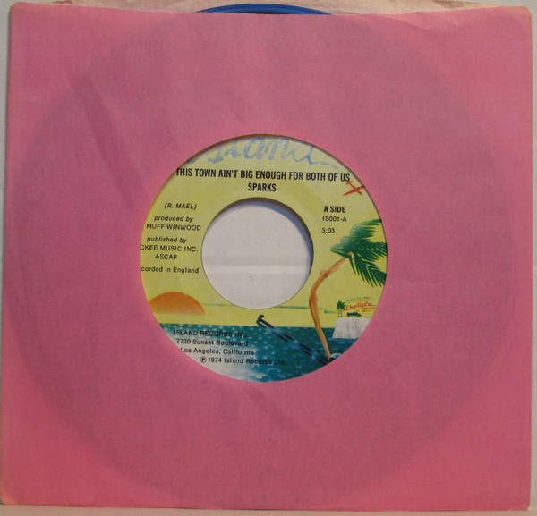 Sparks – This Town Ain't Big Enough For Both Of Us / Barbecutie (Island Records – IS001, 7", 45 rpm, single, styrene, USA, 1974).