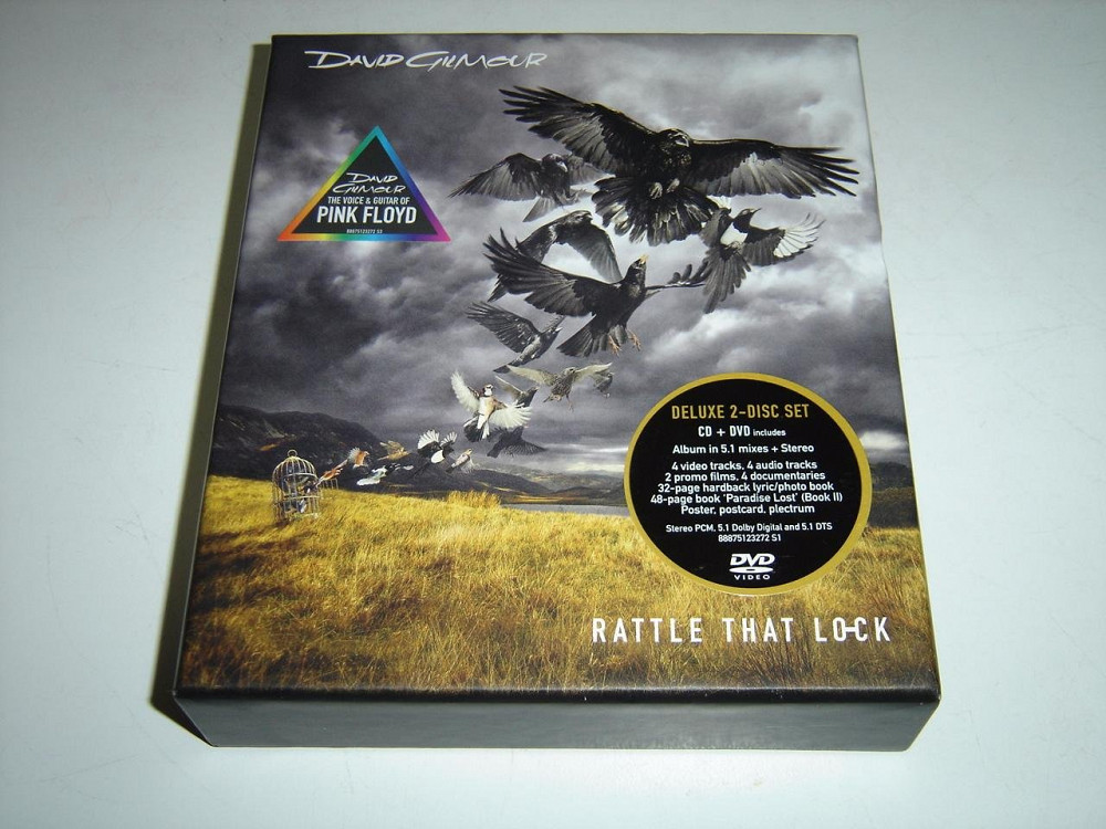 RATTLE THAT LOCK is the solo album by David Gilmour, the voice and guitar of Pink Floyd. This is David's fourth solo album, and the first since 2006's # 1 album "On An Island". The primary lyricist for RATTLE THAT LOCK is Gilmour s long-term writing partner, Polly Samson, and the album is co-produced by David Gilmour and Roxy Music’s Phil Manzanera. The album's striking cover has been art directed by Dave Stansbie. The lead single of this album is the title track, "Rattle That Lock". The song begins with the four notes, created by Michael Boumendil, which precede announcements at French SNCF railway stations which Gilmour recorded on his iphone at Aix station. Samson’s lyrics are inspired by Book 2 of John Milton’s Paradise Lost, which is also featured in her recent acclaimed novel, The Kindness. The single also features the Liberty Choir and singers Mica Paris and Louise Marshall. 2 disc Deluxe Box that includes the CD package, along with a Standard DVD featuring 10 bonus audio-visual tracks, 4 bonus audio tracks, the complete album in Surround Sound, and memorabilia. Deluxe Box include a 32 page hard back photo/lyric book including artist photographs by Kevin Westenberg along with album session photographs by Polly Samson, a 48 page book 'Paradise Lost' (Book II), and memorabilia including a poster, postcard, and plectrum.