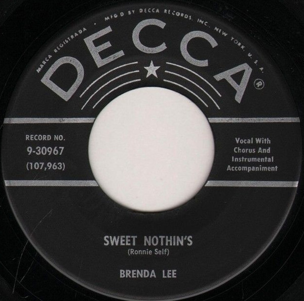 Brenda Lee ‎– Sweet Nothin's / Weep No More My Baby (Decca ‎– 9-30967, 7", 45 rpm, Pinckneyville pressing, USA, 1959).