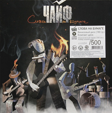 Вінілова платівка. Вісімнадцятий, студійний каталожний альбом російської (радянської) блюз-рок, кантрі-рок групи Чайф (Слова На Бумаге) 2019. Випуск фірми (Kapkan Records) Russia в 2019-ий рік. Оригінальне першопресове видання. Рідкісне (Rare). Комплект: вінілова платівка + CD диск. Лімітований тираж (Limited Edition). 500 копій. Видання нове, запаковане. Категорія S/S. Відправка по Україні службами доставки: Нова Пошта, Укр Пошта, Делівері. Також відправляємо посилки за кордон по цілому світу.