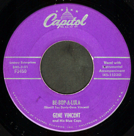 Gene Vincent And His Blue Caps – Be-Bop-A-Lula / Woman Love (Capitol Records – F3450, 7", 45 rpm, single, Scranton pressing, wrong times, USA, 1956).