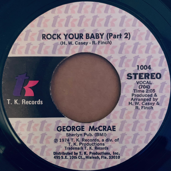George McCrae – Rock Your Baby / Rock Your Baby (Part 2) (T.K. Records – 1004, 7", 45 rpm, single, styrene, Monarch pressing, USA, 1974).