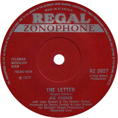 Joe Cocker with Leon Russell & The Shelter People – The Letter / Space Captain (Regal Zonophone – RZ 3027, 7", 45 rpm, UK, 1970).