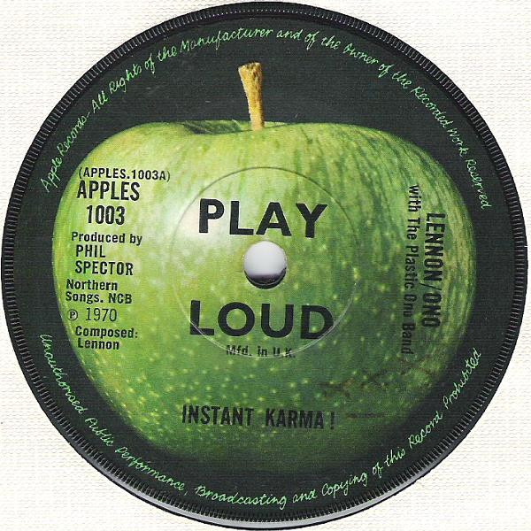 John Lennon - Instant Karma! / Who Has Seen The Wind? (Apple Records – APPLES 1003, 7", 45 rpm, single, solid centre, UK, 1970).