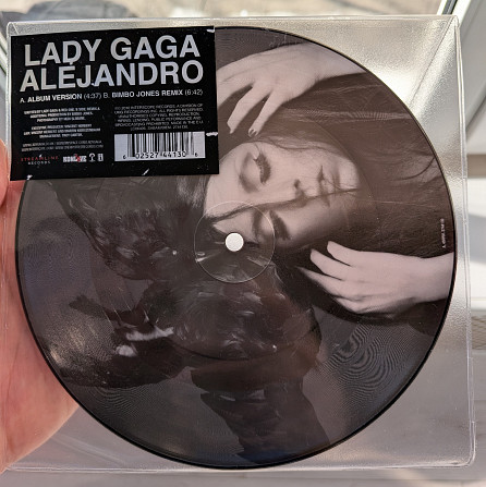 Продам оригінальне європейське видання синглу Lady Gaga – Alejandro 2010 року випуску на 7" Picture Disc платівці, швидкість 33 та 45 RPM в залежності від сторони. Чудовий подарунок колекціонеру або фанату співачки. Грає чудово, але звук такий як в інших Picture Disc, тому можливо аудіофілам не сподобається