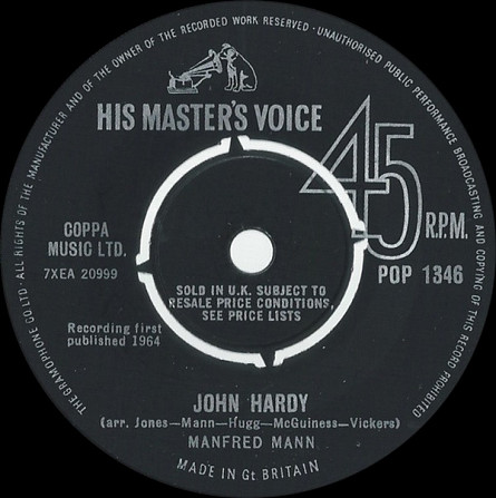 Manfred Mann ‎– Sha La La / John Hardy (His Master's Voice ‎– POP 1346, 7", 45 rpm, single, 4-prong pushout centre, UK, 1964).
