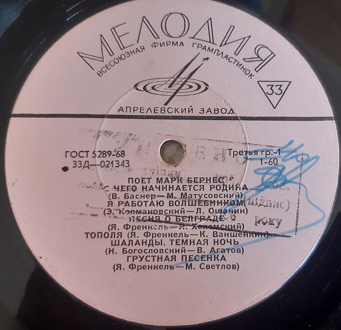 Альбом Марка Бернеса 1968 року, платівка у техконверті. Фірма Мелодія (Апрелевский завод грампластинок), стан - VG.