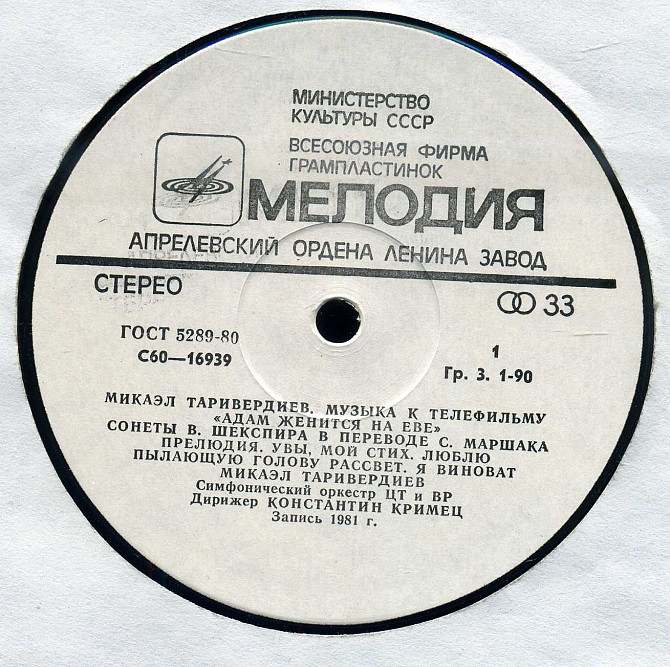МИКАЭЛ ТАРИВЕРДИЕВ МУЗЫКА К ТЕЛЕФИЛЬМУ АДАМ ЖЕНИТСЯ НА ЕВЕ С60---16939 USSR 1981