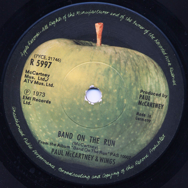 Paul McCartney & Wings – Band On The Run / Zoo Gang (Apple Records – R 5997, 7", 45 rpm, single, Contract pressing, UK, 1974).