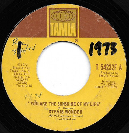 Stevie Wonder – You Are The Sunshine Of My Life / Tuesday Heartbreak (Tamla – T 54232F, 7", 45 rpm, single, styrene, Terre Haute pressing, USA, 1973).