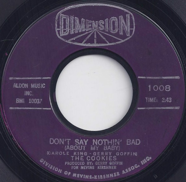 The Cookies – Don't Say Nothin' Bad (About My Baby) / Softly In The Night (Dimension – 1008, 7", 45 rpm, single, styrene, Bestway pressing, USA, 1963).
