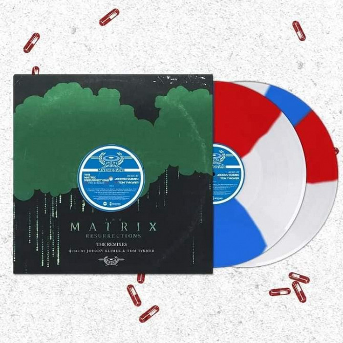The Matrix Resurrections: The Remixes features 11 remixes by Johnny Klimek & Tom Tykwer, Marcel Dettmann, Moderna, Thomas Fehlmann, System 01, Esther Silex & Kotelett, Gudrun Gut, Almost Falling, Psychic Health, Eclectic Youth, and Alessandro Adriani, mastered by James Plotkin (OLD, SCORN, KHANATE) and pressed on 2x 180 gram “Red and Blue Pill Twist” colored vinyl, limited edition to 1000 copies worldwide, factory sealed with original hype sticker, mint copy
