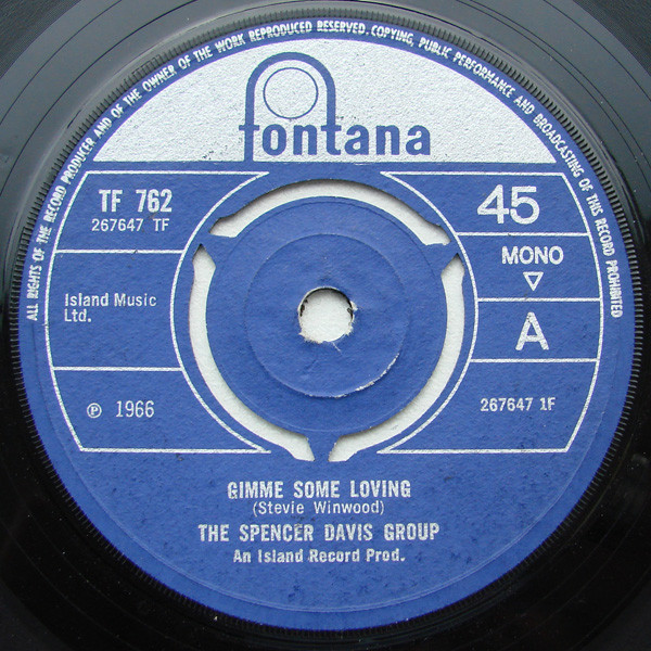 The Spencer Davis Group – Gimme Some Loving / Blues In F (Fontana – TF 762, 7", 45 rpm, single, mono, 3-prong centre, UK, 1966).