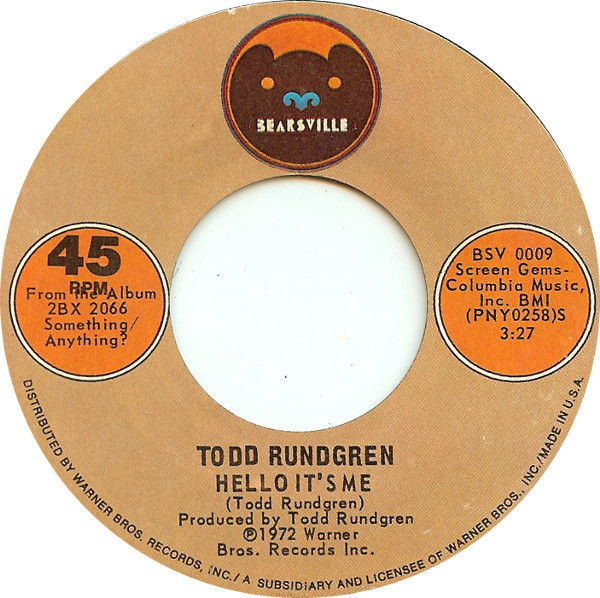 Todd Rundgren – Hello It's Me / Cold Morning Light (Bearsville – BSV 0009, 7", 45 rpm, single, styrene, Terre Haute pressing, USA, 1972).