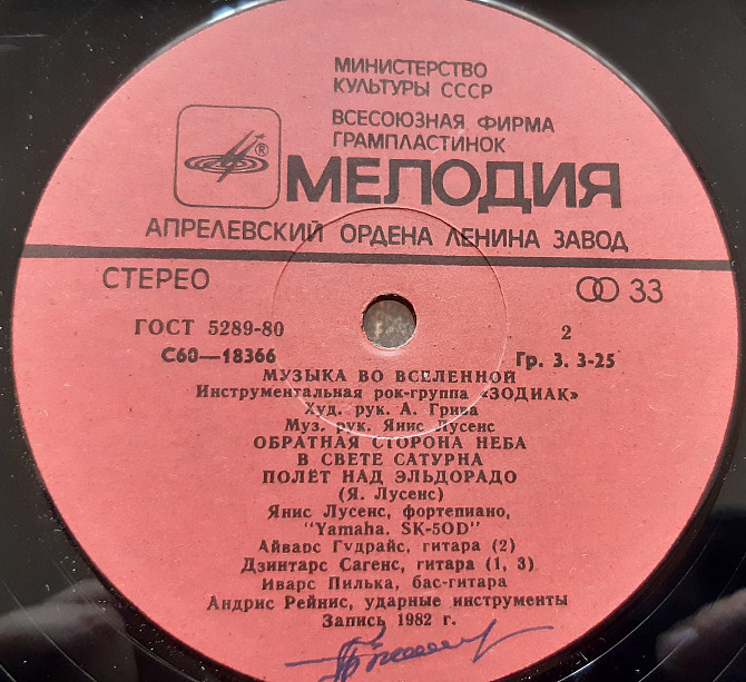 Альбом латвійської інструментальної рок-групи Zodiac 1982 року. Платівка 1982 року випуску, фірма "Мелодія" (Апрелевский завод грампластинок), техконверт. Стан - Ex.